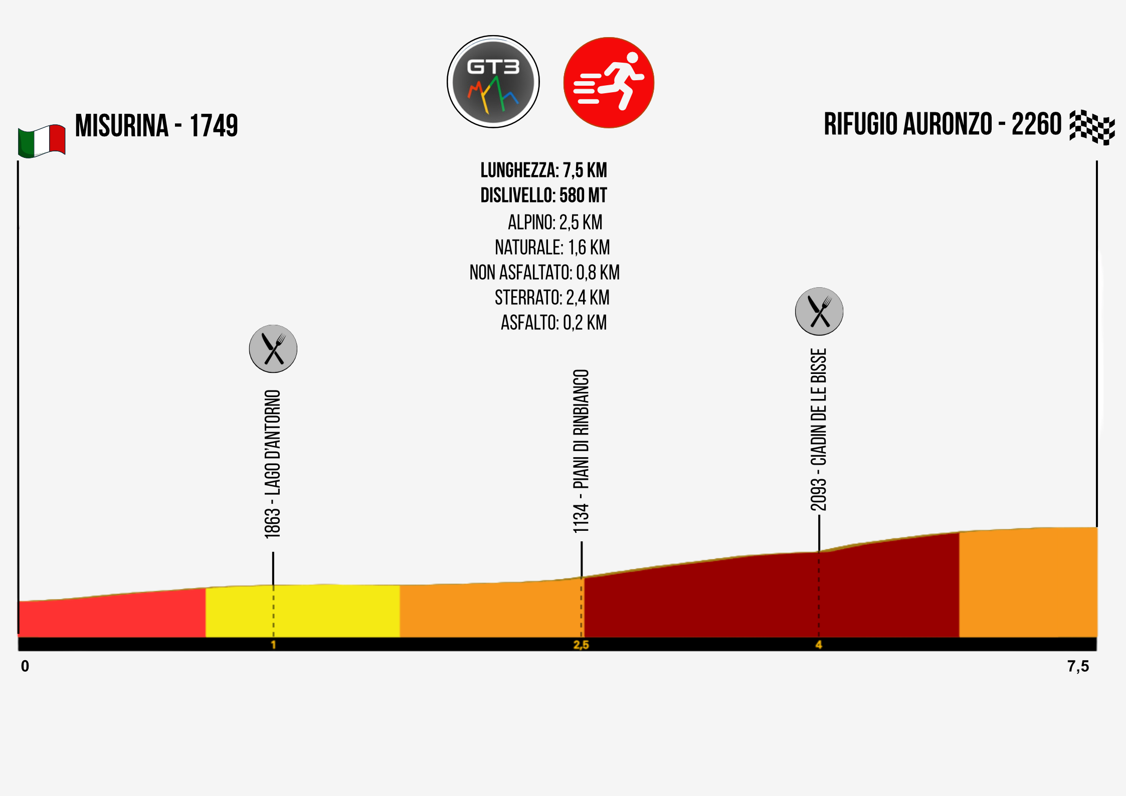 Dopo aver nuotato nelle acque del lago di Auronzo e aver risalito le valli in sella alla tua bici, è il momento di mettere a terra tutta la tua grinta. La terza frazione del GT3 LAVAREDO Gravel Cross Triathlon è più di una corsa: è un’ascesa verso il mito. 7,5 km per 580 metri di dislivello che ti separano dalla gloria, ai piedi dei giganti di pietra.