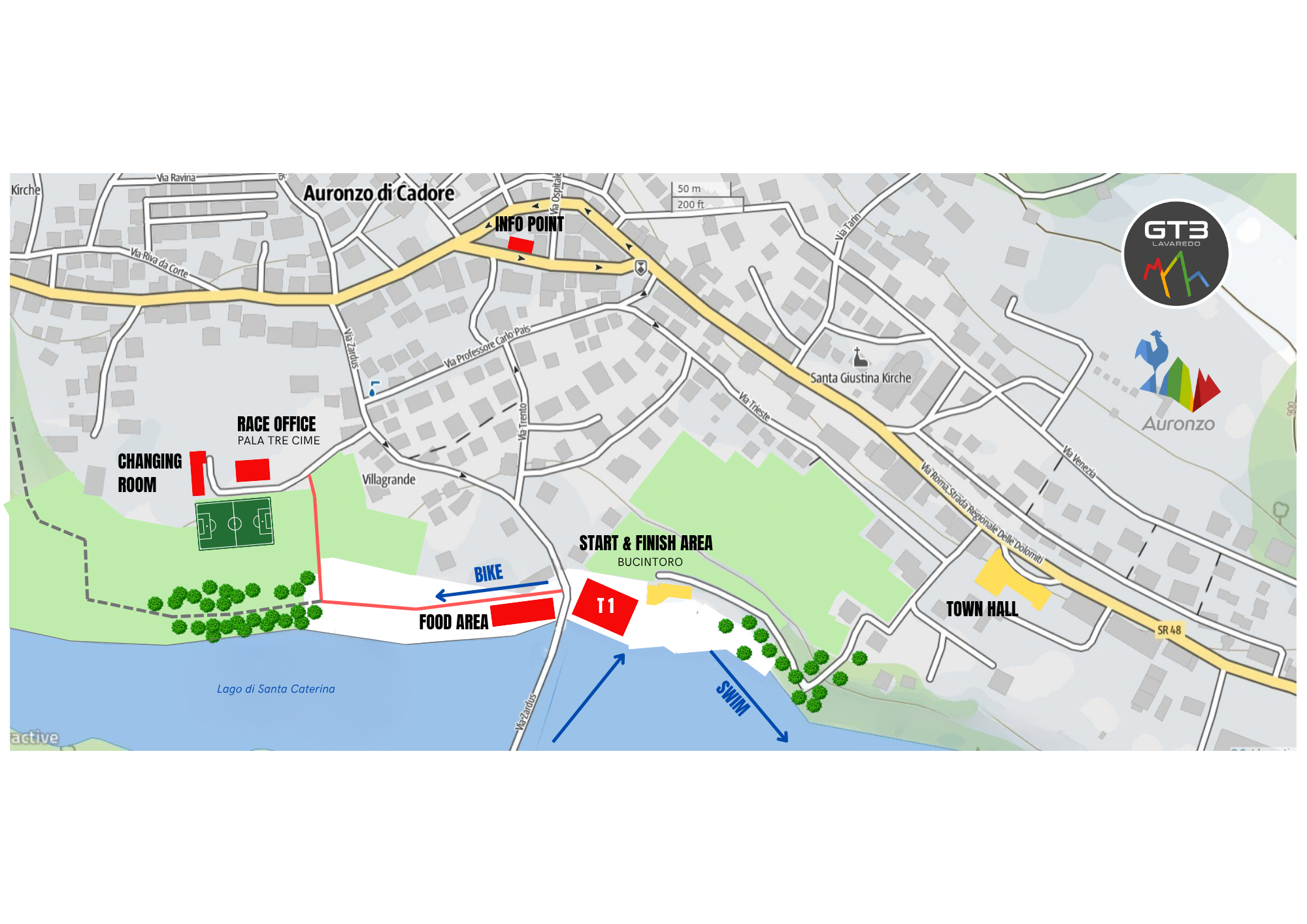 Al Lido Bucintoro, trovi l’area Start&Finish e vicino, sempre sulle sponde del lago Santa Caterina, la Food Area. Inoltre è presente l’area di cambio (T1) per il passaggio dalla frazione di nuoto a quella di bici.