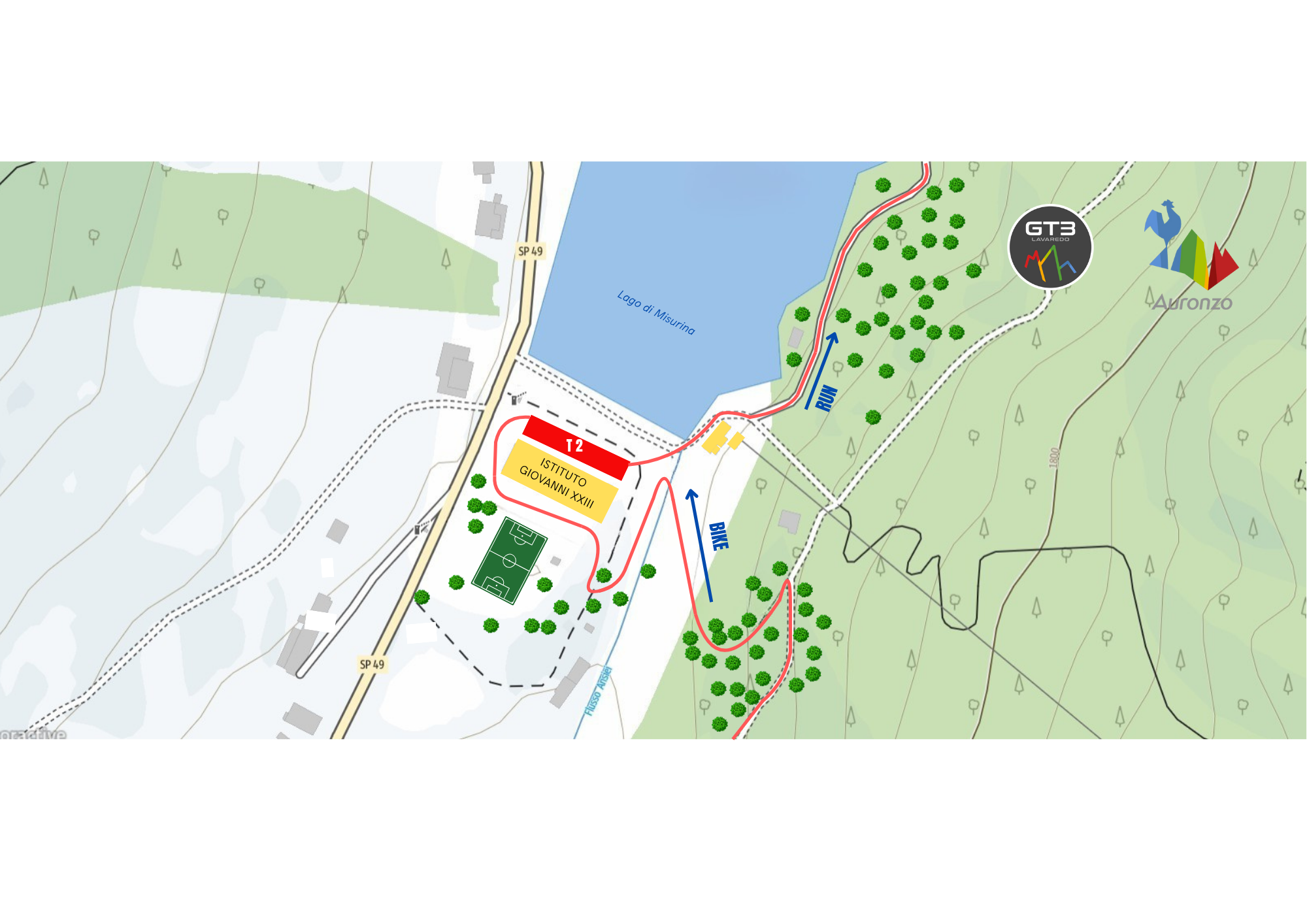 Al lago di Misurina sarà predisposta l’area di cambio T2, di fronte all’Istituto Giovanni XXIII, per il passaggio dalla frazione di bici a quella di corsa.